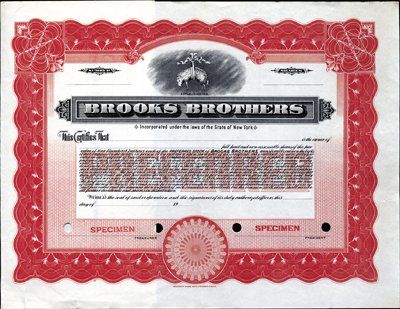 ca.1910's-30's. Odd Shs. Specimen stock certificate. Sheep being held up with ribbon. Red "Specimen" overprints and POC's. Red border. Choice uncirculated. Well known clothier. SBNC.