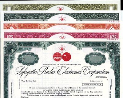 ca.1970's. 5 different specimens stock certificates. All different colors and share amounts. Vignette of radio oscillator, Planet Saturn and atom in red. All with pin punch cancels. All in XF condition. Well known mail order radio component business that catered to home radio and ham radio operators. .SCBNC