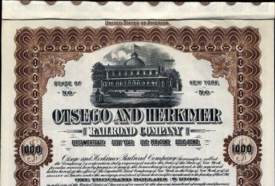 1912. $1,000. Specimen 1st Mortgage 5% Gold Bond. Brown border. Street car with domed building behind it. Red specimen "Cancelled - Security Bank Note Co." overprints and POC's. Coupons attached. Rare certificate. Unlisted railroad in Cox. Rare bond. Unique in archive. SBNC.