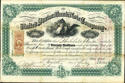 1865. 25 Shs. Rare issued stock certificate from early banknote engraving company. Green Border with ornate "USBN" monograms on 4 corners and on middle bottom. Patriotic allegorical woman with eagle and shield. Signed by Alfred Jones as president. He was born in England and came to the U.S. sometime before 1834. In 1834 he was serving as an apprentice with RWH&E in Albany. In 1866 he became president of USBNC (the earlier unrelated company), from 1868 to 1870 he held the position of Vice-president with British American BNC. He formed a partnership with W.C.Smillie and Francis Edmonds in 1857 and in 1859 it was absorbed by American BNC. Jones became superintendent of the Picture Department of ABNC after this move. He is also known as one of the pioneers in the development of the procedure known as the "Halftone" process. In 1900 he was struck by a hansom (Horsedrawn) cab and later died from his injuries. Unique in archive and extremely rare early ABNC related company. Never seen before. USBNC