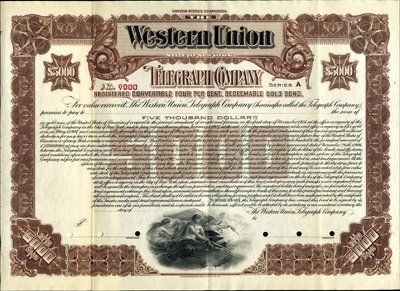 1907. $5,000. Specimen Registered Convertible 4% Redeemable Gold Bond. Chocolate brown border. Allegorical women and angel on bottom with clock. Red "Return to Record and Specimen Room" overprint on back, POC's and "00000" serial numbers. No coupons attached. XF condition. Rare Western Union bond. IBNC