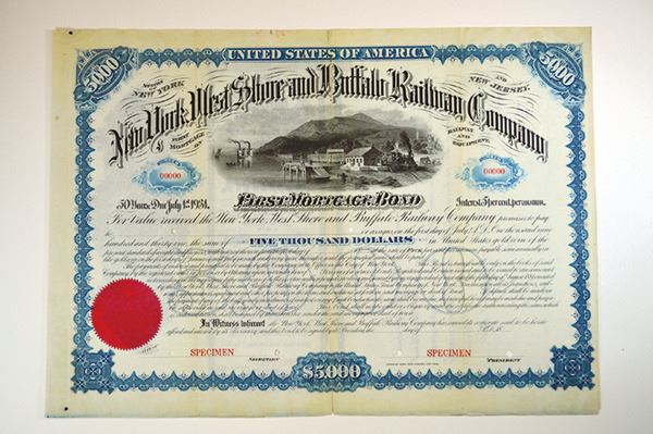 New York. New Jersey. Specimen $5000 1st Mortgage 5% Registered Gold Bond, Black on blue border and underprint, train sitting at station by river waiting for side paddle steamboat approaching dock, VF-XF, ABNC. Extremely attractive bond. Listed in Cox. The last example sold in AIA's auction in 2007-2008.