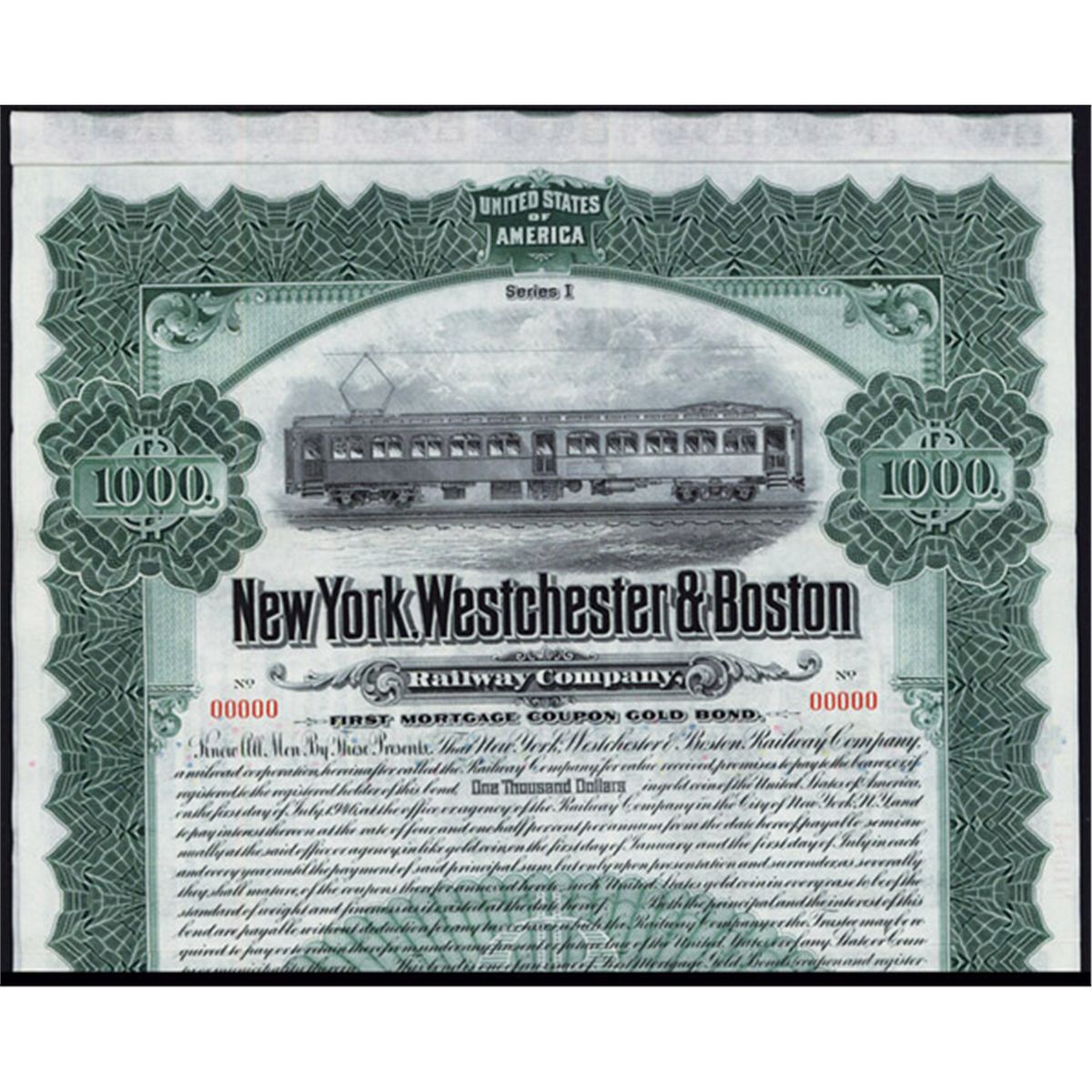 New York, 1911, $1000, 1st Mortgage Coupon Gold Bond 4 1/2%, Specimen certificate, Series I, Black on green border and underprint with electric streetcar on top, Coupons attached, POC's, ABNC, XF condition.