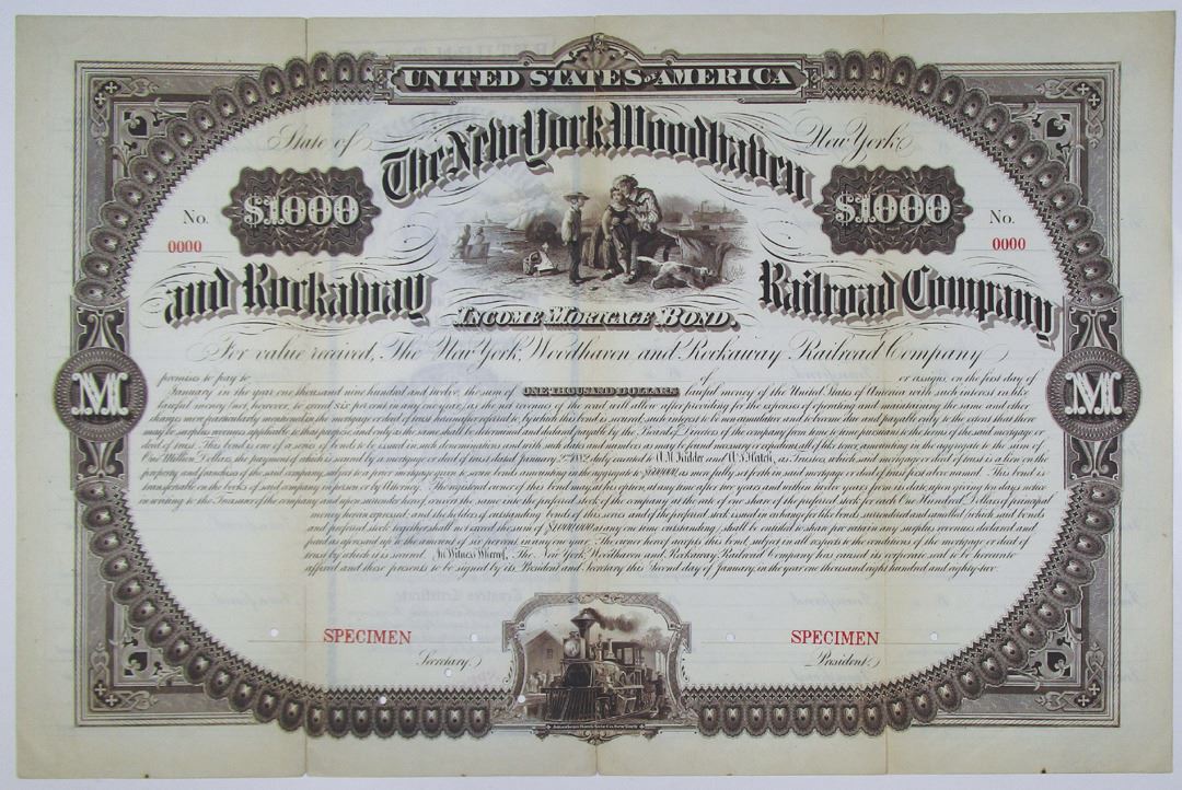 New York, 1882. $1000 Specimen 6% Income Mortgage Bond, Black text with dark brown border, Man with two children and dog at top center. Red specimen overprints, 0000 serial numbers, and POCs. Fine condition with archival reinforcement along fold lines, ABNC. Only listed as a proof in Cox, Very Rare specimen.