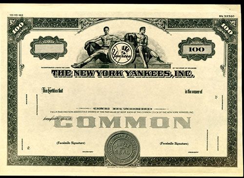 Delaware, 1962, 100 Shares, Photographic Stock proof, Two allegorical men flanking New York Yankees logo top center, Security-Columbian BNC.