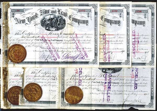 Illinois. Stock Certificates. Issued. Cancelled. Various dates and amounts. Paper tone at left end from register book mounting. Generally VF. 8 pieces.