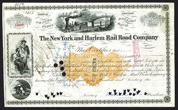 New York, 1873, 100 Shares, I/C Stock Certificate, VF condition, 25 cts Imprinted Revenue in middle. William K Vanderbilt (grandson of Cornelius Vanderbilt) signature with POC's through it, as president. ABNC.