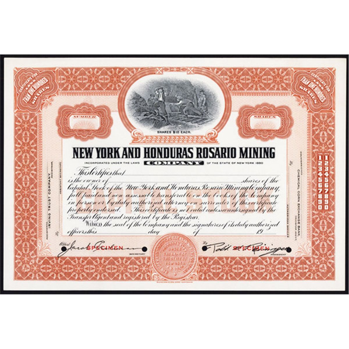 New York, 19xx (ca.1920-30), <100 shs., Specimen Stk. certificate, Brown border with Mining scene, Specimen overprints, POC's, HBNC., XF to Uncirculated condition.
