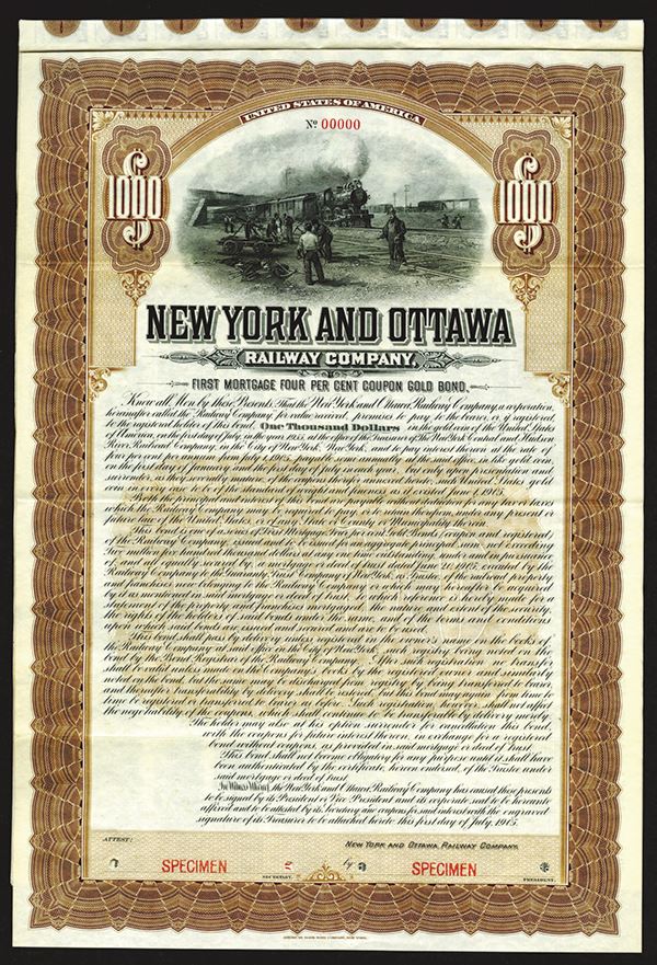 New York and Canada. Specimen $1000 1st Mortgage 4% Coupon Gold Bond. Light brown border and undertint. Track workers with train approaching. VF. This is the same Bond that we last offered in our February 2009 Auction and is the one that is the pictured bond in Cox. Rare and very attractive bond. ABNC.