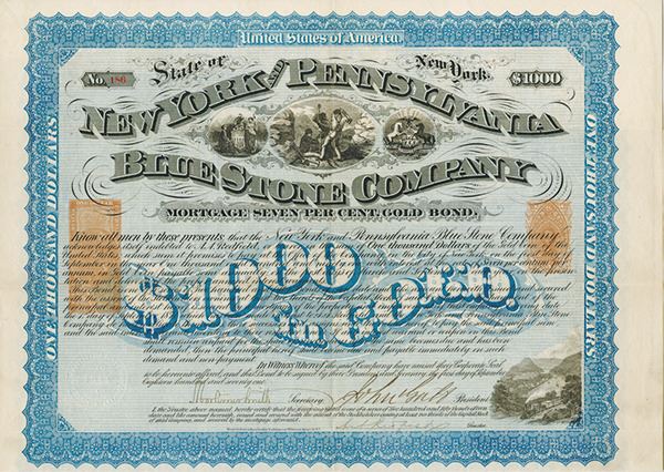 New York, 1871, $1,000. I/U, 7% mortgage gold bond, Blue border w/ quarry workers in middle, arms of New York and Pennsylvania on right and left, Two imprinted federal revenues (RN-P5, RN-W2), file folds Henry Siebert & Co, NY, w/coupons, VF, Scarce and very attractive IR bond.
