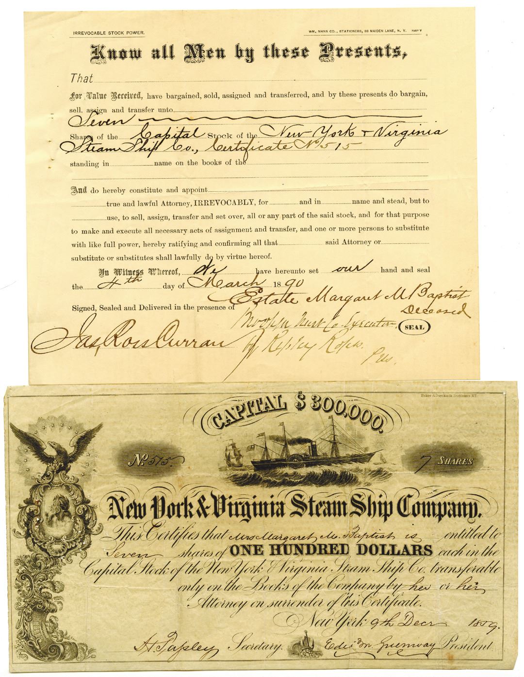 New York, 9th of December, 1859, Lot of 4 items, Includes 7 Shares, I/U Stock certificate, Black on off white paper, Large Side wheel steamship in rough seas in middle over title, Eagle and bust of Neptune at left, small cornucopia at bottom middle, S/N 575, A couple of small pin holes with lightly aged paper and heavy creases but appears VF; Also includes an 1890 dated letter from Adrian H. Muller & Son, "Stocks and Bonds Bought and Sold at Private Sale", It was sold on May 5th, 1890 for $6 for this certificate. Also includes a receipt from the City of Brooklyn's Surrogate Court and matching transfer from the owners estate. Attractive and rare if not unique stock certificate which was purchased at the 12th Annual Strasburg Stock & Bond Show #182 on January 22, 1999, as lot 2082 where Hammer and BP realized $1,045 on an estimate of $400 to $600. Those were the days. Rare and desirable navigation certificate. (John E. Herzog Collection).