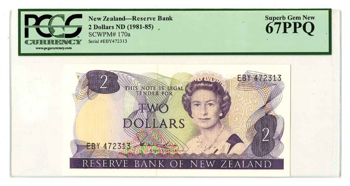 New Zealand, ND (1981-1985). 2 Dollars, P-170a, Issued Banknote, Purple and m/c underprint with Queen Elizabeth II at right, Back is purple on m/c with bird at center, S/N EBY472313, PCGS graded Superb Gem New 67PPQ.