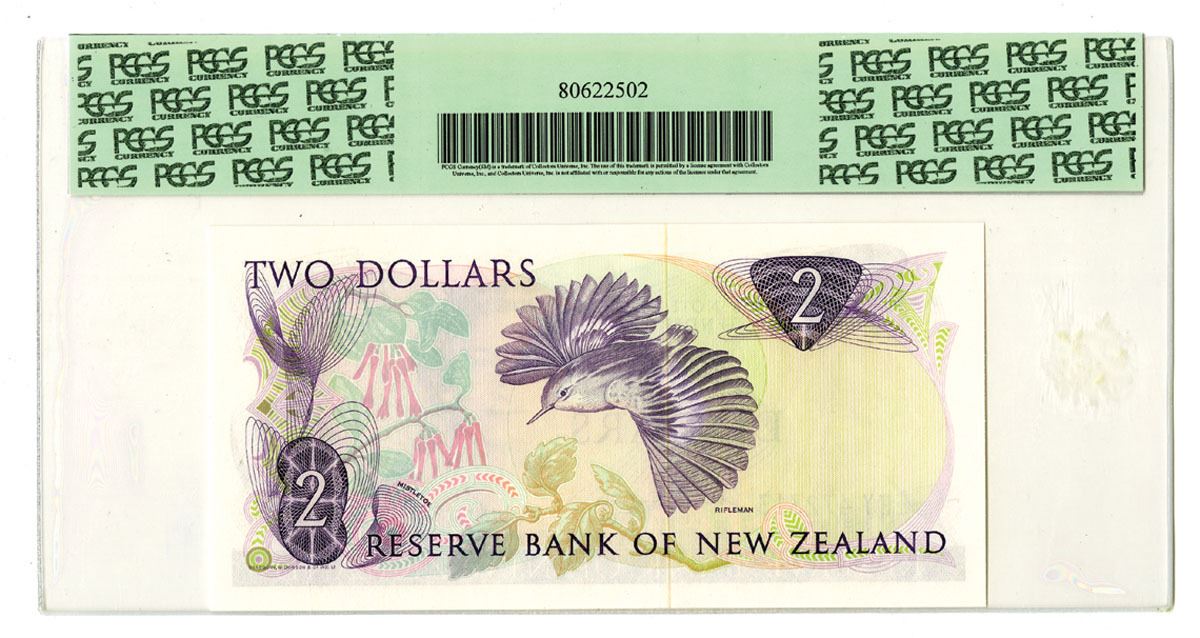 New Zealand, ND (1981-1985). 2 Dollars, P-170a, Issued Banknote, Purple and m/c underprint with Queen Elizabeth II at right, Back is purple on m/c with bird at center, S/N EBY472313, PCGS graded Superb Gem New 67PPQ.