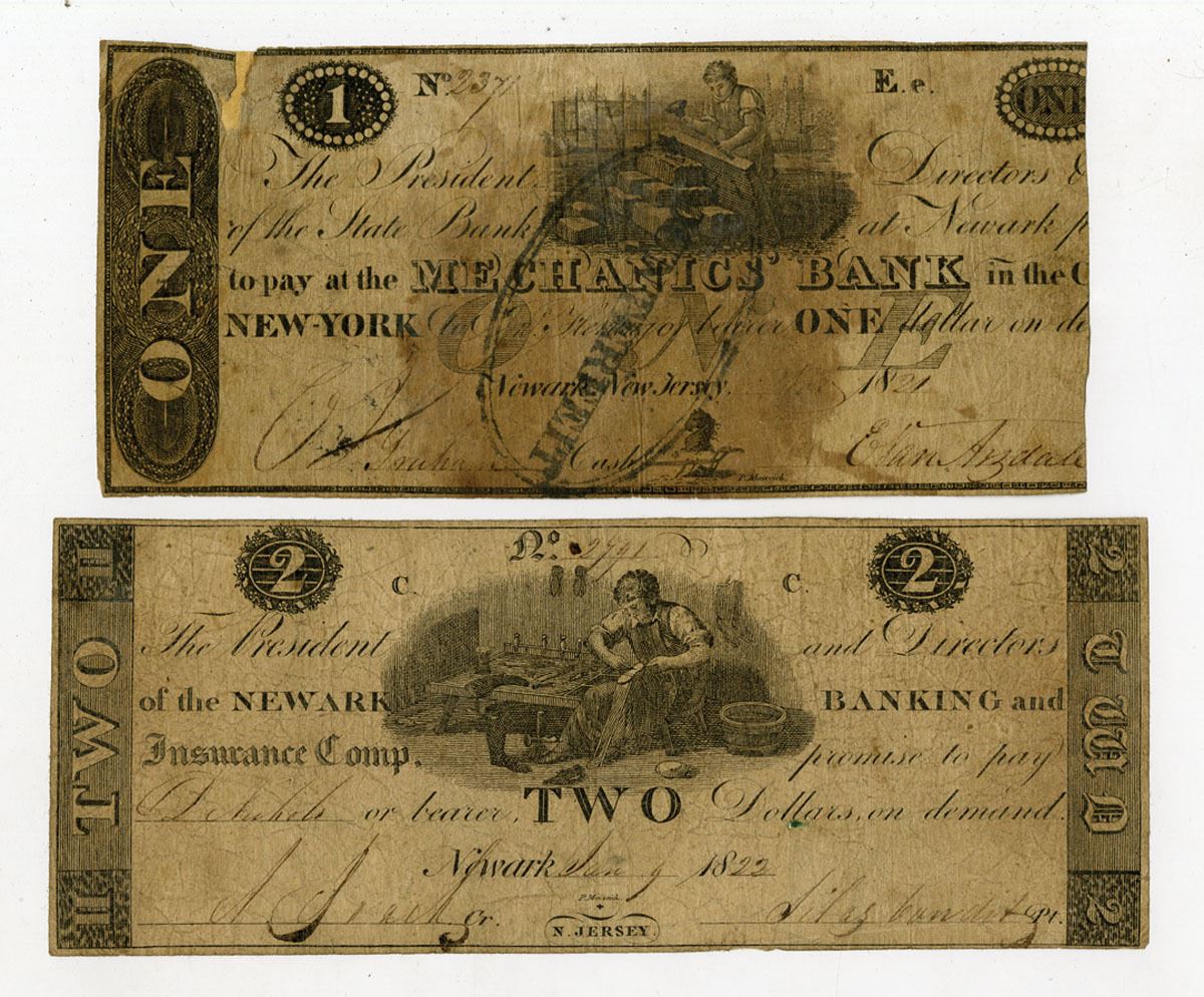 Newark, New Jersey, Lot of 2 Banknotes, Includes 1821, $1, Contemporary Counterfeit Banknote, Woodworker at top, S/N 2371, "Counterfeit" stamp over face, Top left corner has been archivally repaired; and, 1822, $2, Wait # 1483 Rarity 6 (6 to 10 known), Issued Banknote, Cobbler at top, S/N 2791. Notes range from VG to Almost Fine condition. (2). Sold "AS IS" no returns accepted.