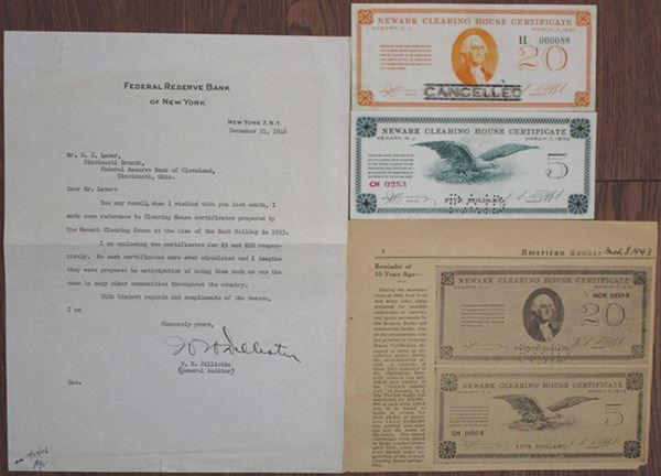 Newark, NJ. Lot includes 5 pieces: $5, 1933 Newark Clearing House Certificate in green; $20 Newark Clearing House Certificate in orange; Letter sent on Federal Reserve Bank of New York letterhead, stating that the $5 and $20 certificates are enclosed, and that they have never been circulated to the public; Printed paper stock with the message "Currency Certificates prepared under the direction of special committee of the Newark Clearing House Association March 5th to 12th, 1933"; and a newspaper article that provides further provenance for the certificates. During the 1933 Great Depression, many cities in America prepared for "possible suspension of currency...by the Reserve Banks and commercial banks." Clearing House Certificates were designed to serve as circulated currency during a possible reorganization period. The article states that less than $4,000,000 were printed, and none ever entered public circulation. "The unused engravings were stored in large wooden crates until 1941, when they were burned under supervision of the Newark Clearing House authorities." Rare piece of a little-known element of Great Depression fiscal history with included provenance. Rare Depression Scrip Pair and related documents. (5)