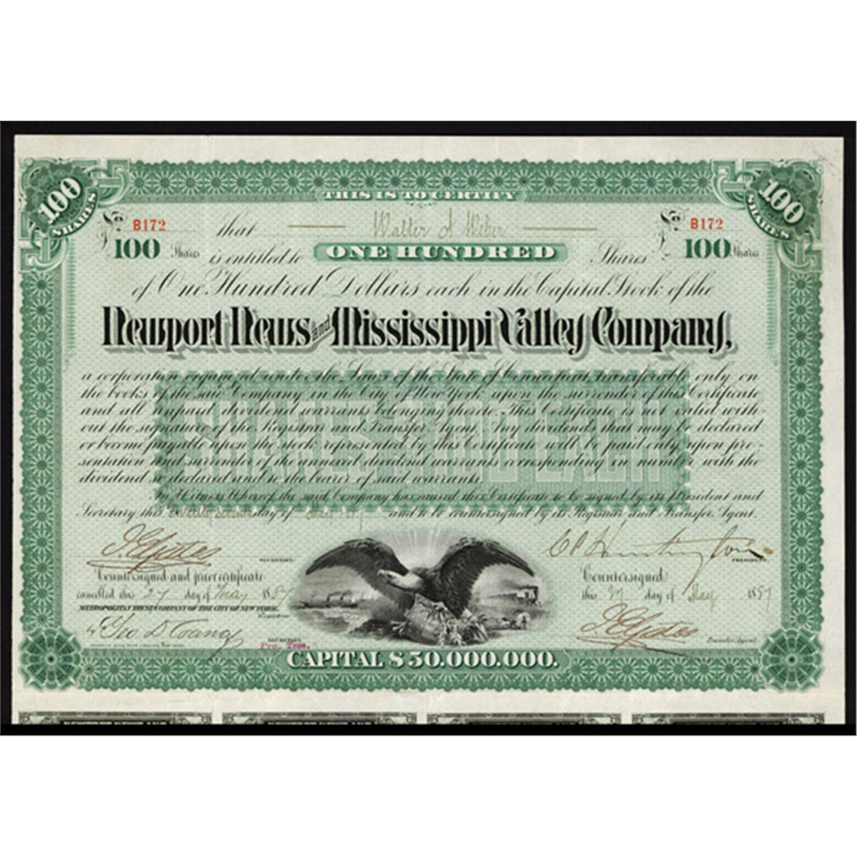 Virginia, Newport News, 1857, 100 Shs., Eagle and shield, Green, ABNC, XF. Signed by Collis P. Huntington, one of the Big Four railroad barons who helped build the Central Pacific Railroad, which formed part of the first U. S. transcontinental railroad. ABNC.