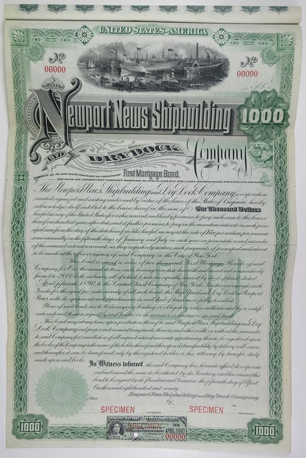 Virginia, 1890. $1000 Specimen 5% First Mortgage Coupon Bond, Black text with ornate green border and undertint, Scene at top of ship disembarking from dry dock. Red specimen overprints, "00000" serial numbers, POC's, VF condition. Printed by ABNC.