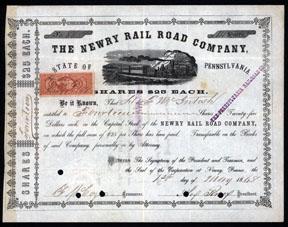 PA,1868, 14 Shares, #88, Black, Locomotive L/R. Punched cancelled, Overprint - The Pennsylvania Railroad Co. Adhesive revenue stamp. VF condition with toning. Scarce Pennsylvania bond.