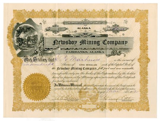 Fairbanks, Alaska. 500 Shares Issued Capital Stock Certificate, Black print on gold border and under tint, Men working in mine to left of tile, Low certificate number #43, VF-XF condition.