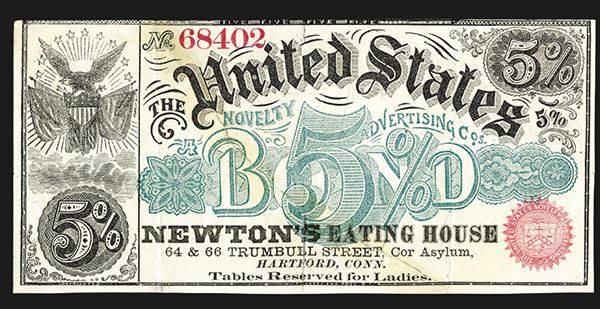 Hartford, CT. Advertising Note. Newton's Eating House. Trumbull St. Hartford, CT. Ripped diagonally and repaired. With tape. Fine.