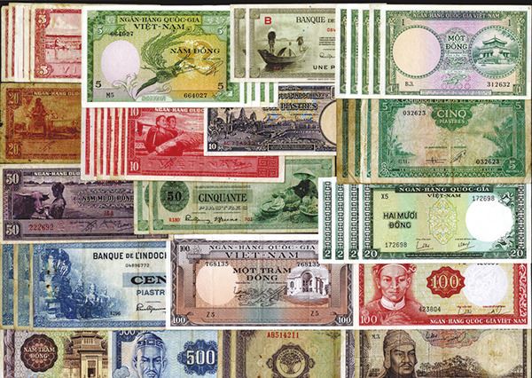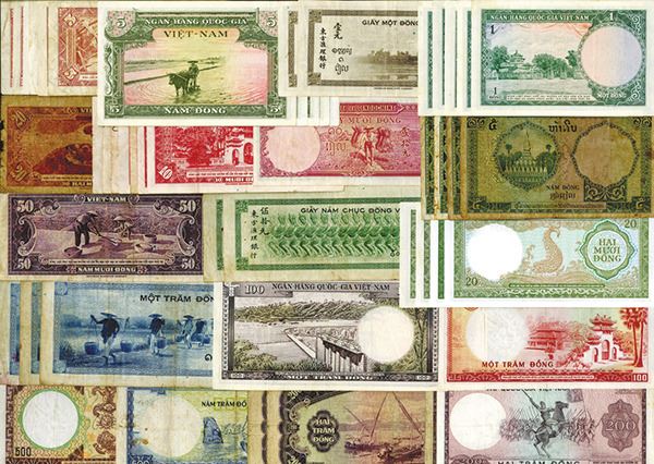Viet Nam, South. 40 pieces, along with Banque de L'Indochine (9), and Institut d'Emission des Etats du Cambodge du Laos et du Vietnam (4). Mostly Choice Very Good to VF, a few better. 53 pieces.