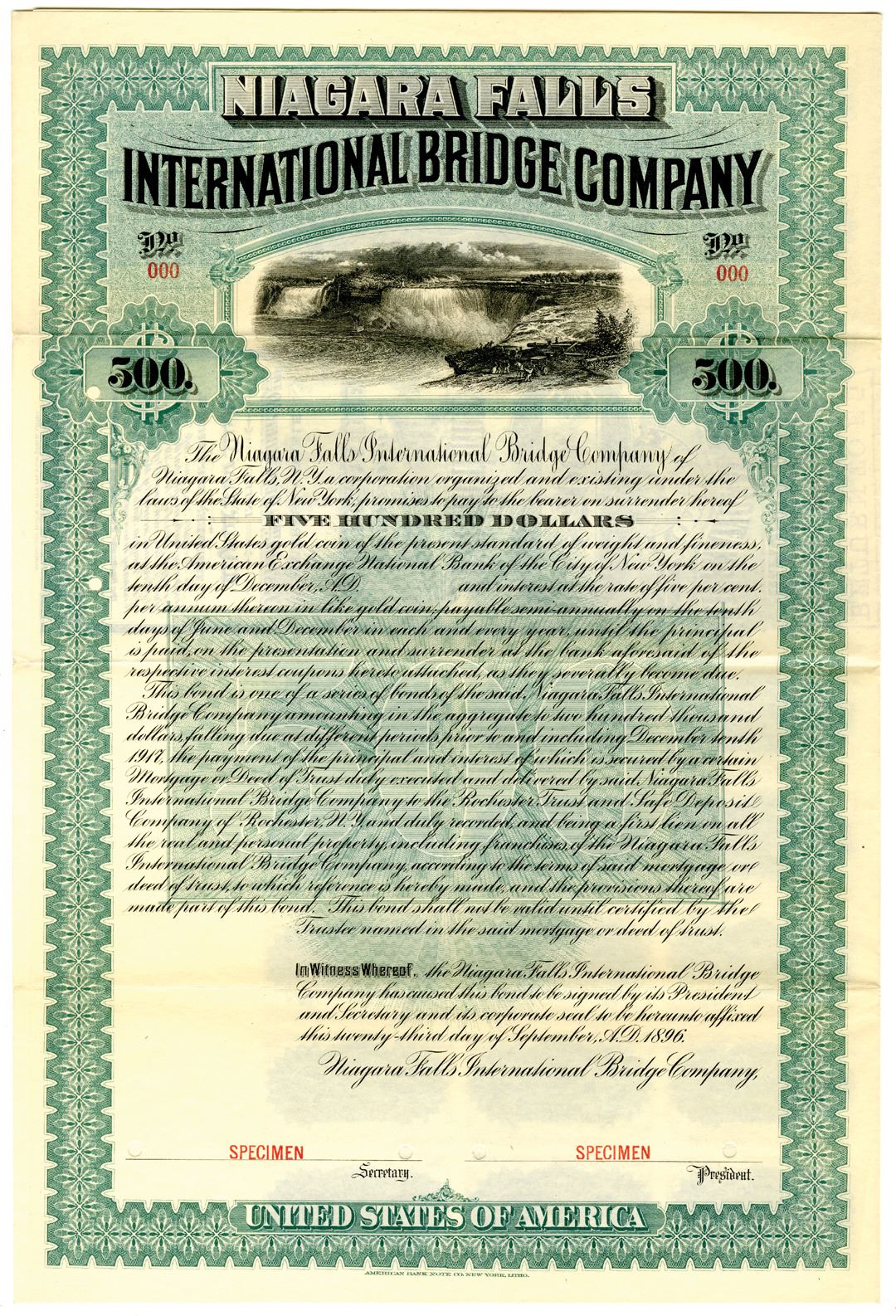 New York, 1896. $500 Specimen 5% First Mortgage Gold Coupon Bond, Black text with green border and undertint, Niagara Falls depicted at top center. Red specimen overprints, 000 serial numbers, and POCs. Fine-VF condition, ABNC. The Niagara Falls International Bridge Company was one of the companies that maintained the Niagara Falls Suspension Bridge, which stood from 1855 to 1897 across the Niagara River and was the world's first working railway suspension bridge.