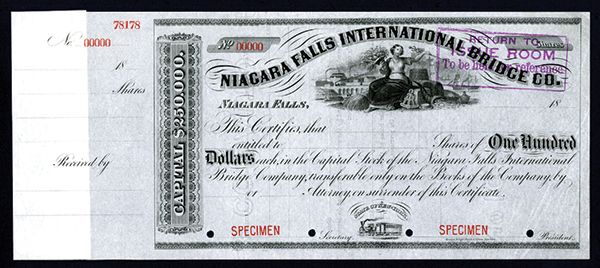 Niagara Falls International Bridge Co., 18xx (ca.1850's), Specimen Stock Certificate. New York, Odd Shares, Specimen stock, Seated allegorical woman with ships, trains and canal boats behind, train on bottom, Specimen overprints, POC's, XF, RWH&E.