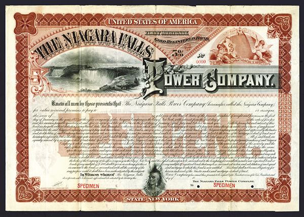 Niagara Falls, New York, 1891, $1000, Specimen 5% Registered Gold Bond, Brick red Border with Niagara Falls on left and Native American at bottom with Cherubs on top right, POC, Fine to VF with minor small tears in margins, rare and dramatic design. ABNC.