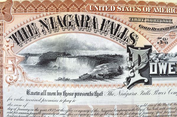 New York, 19xx (ca.1900-1910). $-odd, 1st Mortgage 5% Gold Bond. Red-brown border and undertint. Impressive looking bond with vignette of American Indian on bottom and Niagara Falls on UL with cherubs on UR with ornate title. Red SPECIMEN overprint and POC. Fine-VF condition with edge tears and rough edges on top. ABNC.