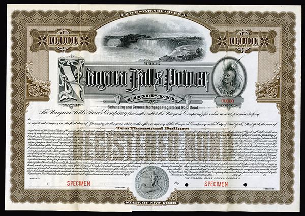 New York. $10000 Specimen 6% Refunding and General Mortgage Registered Gold Bond, Black print on brown border and under tint in horizontal format, Image of Native American next to company title underneath image of Niagara Falls, Specimen overprints and POC's, VF-XF condition, ABNC.