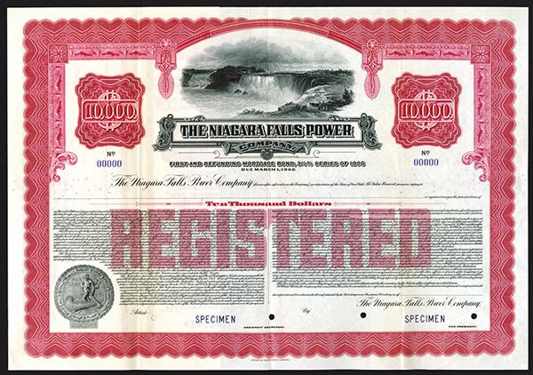 New York, 1936, $10000, 1st and Refunding 3 1/2% Mortgage Specimen Bond, Horizontal format, Vignette of the Niagara Falls top center, POC's blue SPECIMEN overprints and blue s/n "00000", VF condition, ABNC.