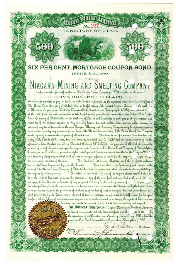 Utah, 1893. $500 I/C 6% Mortgage Coupon Bond #227, Green text with green border, Men at work in mine at top center. Fine-VF condition, ABNC. The Niagara Mining and Smelting Company was controlled by a majority stock held by the U.S. Smelting and Refining and Mining Company.