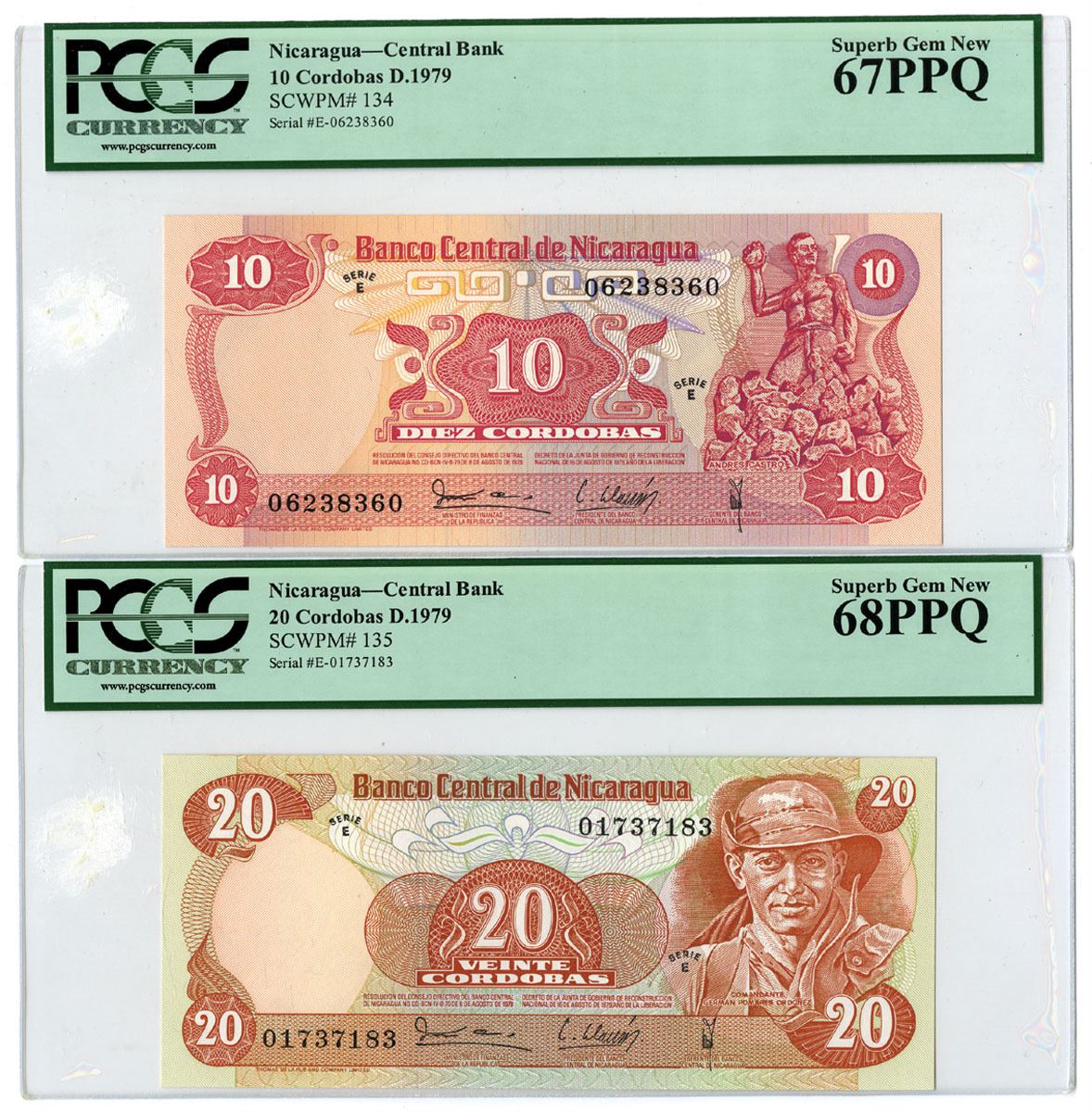 Nicaragua, D.1979. Lot of 2 Issued Banknotes, Includes: 10 Cordobas, P-134, S/N E-06238360, PCGS graded Superb Gem New 67PPQ; 20 Cordobas, P-135, S/N E-01737183, PCGS graded Superb Gem New 68PPQ. (2). Attractive banknote pair.