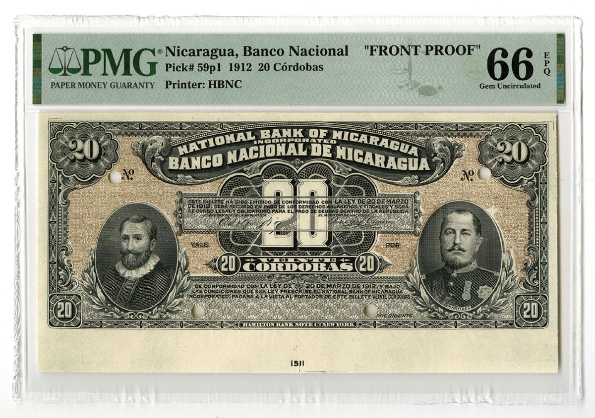 Nicaragua, 1912. 20 Cordobas, P-59p1, Front Proof Banknote, Printed on india paper that is unmounted, Black on tan underprint with portraits of Martinez at right and Cordoba at left, 4 POCs, PMG graded Gem Uncirculated 66 EPQ with comment "Selvage Included," HBNC. This is the highest graded example out of 6 graded in the PMG census. This will be impossible to improve upon.