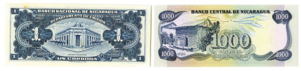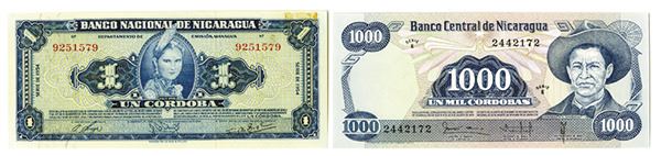 Nicaragua, Lot of 2 notes, Includes 1954, 1 Cordoba, P-99a, Uncirculated to CU with a small stain on top right; and 1979, 1000 Cordobas, P-139, CU to Gem Unc. Attractive pair of notes, TDLR.