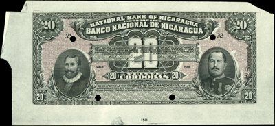 1912. P-59 Unlisted. 20 Cordobas. Proof. Color trial with Purple undertint. Unpriced in Pick. Printed on India paper. Very rare note. Choice condition with large margins. HBNC. Uncirculated.