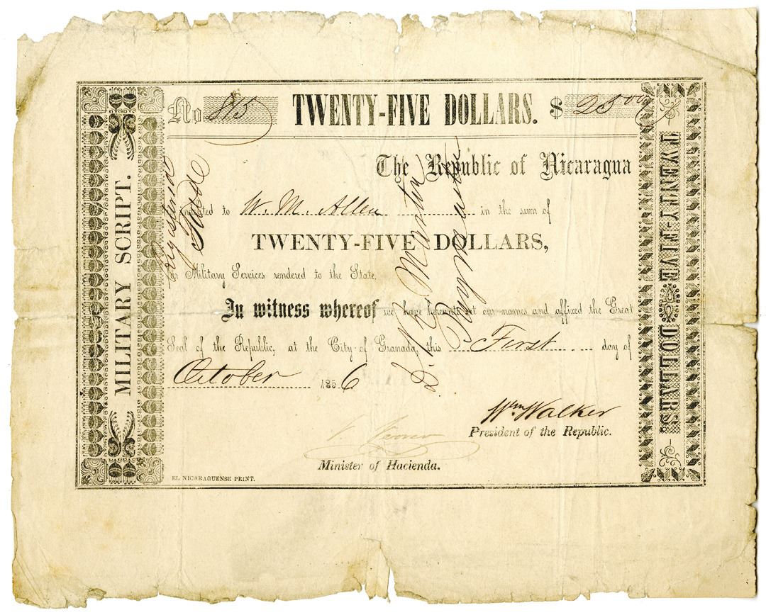 Granada, Nicaragua. 1st October 1856, Issued $25, P-S131 (Unlisted date), Issued banknote, black printing on light yellow paper, 9 x 7 inches, S/N 815, Issued to W.M. Allen for $25 for Military Services, signed by Wm. Walker as President of the Republic; also signed by the Minister of the Hacienda, F. Ferrer and also signed by D.?? Martin as Paymaster with Allen's endorsement on the back. Fine to Choice Fine condition but there is a strong horizontal fold in the middle with splits on the edges and small holes due to folding and wear, the top and bottom margins are rough due to handling. William Walker (May 8, 1824 Ð September 12, 1860) was an American physician, lawyer, journalist, and mercenary who organized several private military expeditions into Mexico and Central America with the intention of establishing English-speaking colonies under his personal control, an enterprise then known as "filibustering". Walker usurped the presidency of Nicaragua in July 1856 and ruled until May 1, 1857, when he was forced out of the presidency and the country by a coalition of Central American armies. He returned in an attempt to re-establish his control of the region and was captured and executed by the government of Honduras in 1860. Historic Nicaragua Fiscal document with only 2 previous examples graded in the PMG census, this being the third if graded and only one example on record of this denomination being offered which was at a R.M. Smythe Auction in June 1998, grading in XF condition where it sold for $8,250. (John E. Herzog Collection).