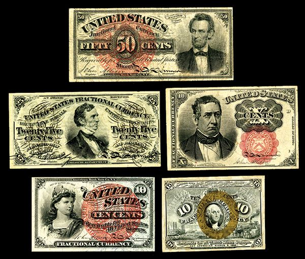 Nice Assortment of Fractional Currency Notes. 1860s and 1870s. 1) Fr#1246, 10 Cents, 18-63-S, Unc. Details, but there are mounting stains and a pinhole. 2) Fr#1297, 25 Cents, green back, AU, pinholes. 3) Fr#1261, 10 Cents, Unc. 4) Fr#1374, 50 Cents, Lincoln, Fine. 5) Fr#1265, 10 Cents, VF.