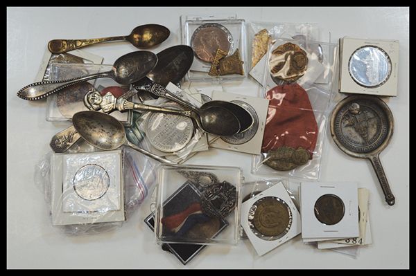 Nice Grouping of So-Called Dollars and Related Items. 1876 HK-74. Colonial Independence. AU detail, rim nicks; 1893 HK-165. Columbian Expo. Birdseye View. EF, toned; 1894 HK-245a. California Midwinter Expo AU; 1901 HK-292. South Carolina Inter-State and West India Expo. VF; 1904 HK-302. Lewis & Clark. EF-AU, toned in spots; 1904 HK-306. Louisiana Purchase. AU, toning spots; 1904 HK-309. Missouri Dollar. EF-AU; 1904 HK-314. PAX Dollar. Uncirculated; 1904 HK-315. Exhibition Palace Dollar. AU; 1904 HK-319. Palace of Electricity / Fraternity. Uncirculated; 1904 HK-323. International Nickel; 1905 HK-327. Woman between males. Uncirculated; 1909 HK-383. Hudson Fulton small letters. AU. Also included are encased Indian Cents from the Pan-American Expo(2) and from the 1904 St. Louis World’s Fair, Days of ’49 souvenir $50 slug, souvenir exposition spoons and other assorted items. [40+]Should be seen. Sold as is, weight approximately 2.25 lbs.