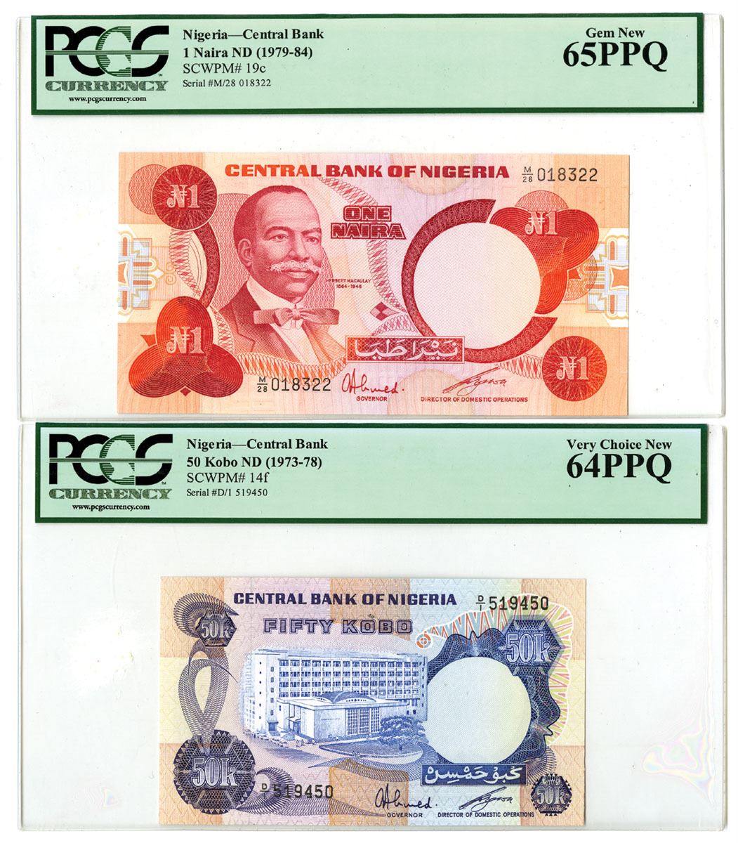 Nigeria, ND (1973-1984). Lot of 2 Issued Banknotes, Includes: ND (1973-1978), 50 Kobo, P-14f, S/N D/1 519450, PCGS graded Very Choice New 64PPQ; ND (1979-1984) 1 Naira, P-19c, S/N M/28 018322, PCGS graded Gem New 65PPQ. (2). Attractive banknote pair.
