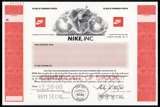 Oregon, 2000, Odd Shares, Specimen Stock, Black on red border and underprint, Vignette of Mercury top center with globes on either side with blue Nike logo beside them, VF-XF condition, SCBNC.