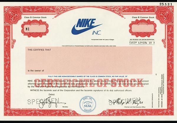 Oregon. Odd Shares Specimen Common Stock Certificate. Black ink with pink border and under print, with a blue under print as well. Company logo at top center of certificate. Pin punched specimen. VF, SCBNC.
