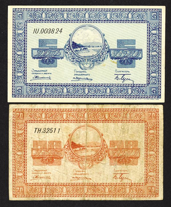 Russia - East Siberia. 5, 20 Rubles. P-S1233, S1235. Blue, orange. Very Fine or better, Very Good. 2 pieces.