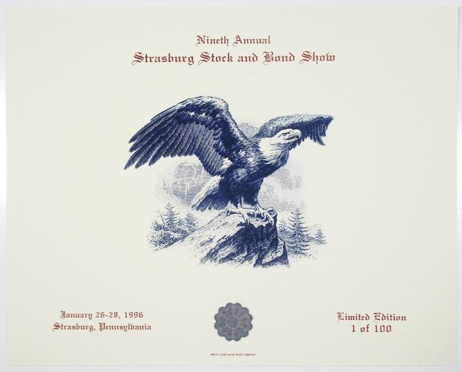 Pennsylvania, 1996. Limited Edition Souvenir Card for the Nineth (misspelled) Annual Strasburg Stock and Bond Show, 1 of 100. Dark red text with large blue intaglio eagle on rock at center. Printed by the Great Lakes Bank Note Co.