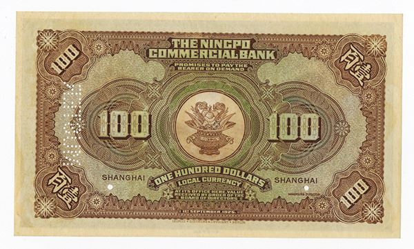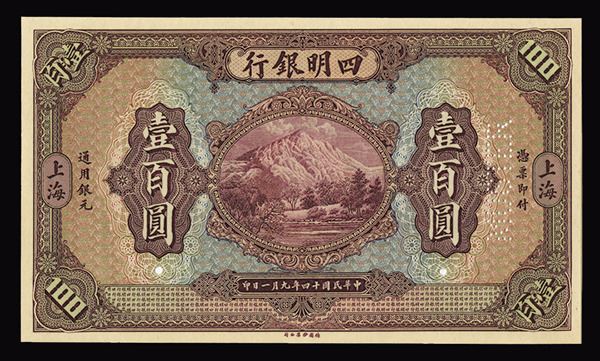 Shanghai, China. $100, P-548B (S/M#S107-35) Unlisted Specimen, Violet on light blue and m/c underprint, Mountain landscape at center, no serial numbers, back violet and m/c, 2 very small 1.5 mm security cancellation punctures in signature blocks and Pin-Punch "MUSTER" vertically near right margin, Appears Gem Uncirculated, Extremely rare if not unique specimen from a new find of G&D specimens and a spectacular note for the advanced collector. G&D.