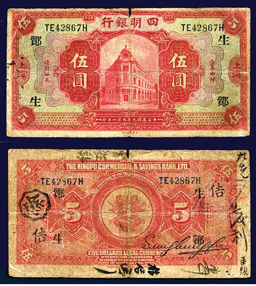 China, $5, P-541, (S/M#C107-12), Issued banknote, Red on m/c, Bank building at center, S/N TE42867H, With various printed and inked validations. Choice Fine to VF with split on top middle margin and small piece missing in middle top, ABNC.