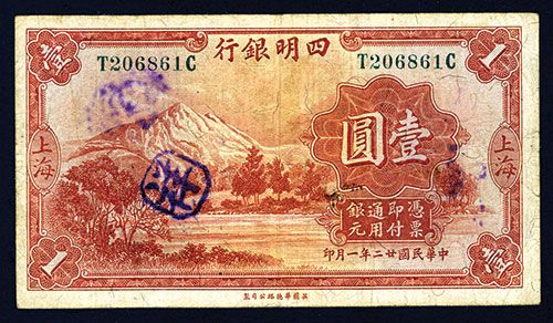 $1, P-549b (S/M#S107-40a), Issued banknote, red-brown on face with mountain landscape, back green, Blue serial numbers, Chop marks on face and back, VF to VF+ condition, bright colors, sharp corners and large even margins enhance the appearance of this scarce note. W&S