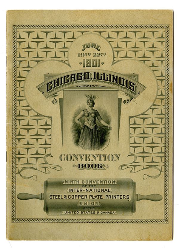 Chicago, IL. June 19th to 22nd, 1901. Convention Book, 6.5 x 8 inches, Intaglio printed front and back cover with Standing Allegorical Warrior woman on face and man and woman operating spider press on back with "Union No. 4" as a caption of the image. 25 pages including advertisements, portraits of members, and a single intaglio printed advertising Sheet by Western Bank Note Co. with locomotive leaving station with information about the company, uniface on thick very light yellow paper. First time seen by cataloger and in excellent condition. Rare and very early Plate printers Convention book. WBNC.