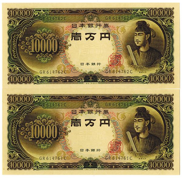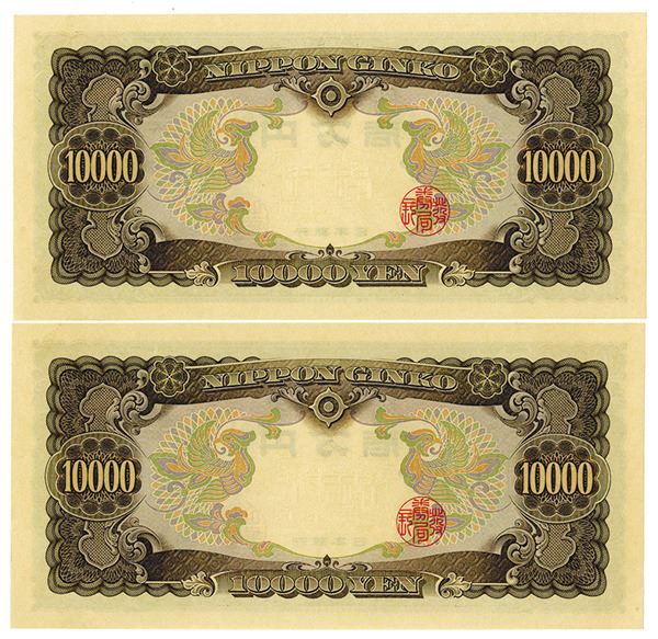 JapanÉ.. Lot includes a sequential pair of 10,000 Yen banknotes, double letter prefix. P-94b. Gem Unc. (2)