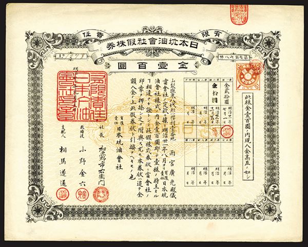 Japan. Nippon Kohyu Yugen Sekinin Kaisha [Japan Oil Pit LLC - apparently an early word for oil well or oil exploration] Y100 (Y30 paid in), Meiji 21[1888].9.15.